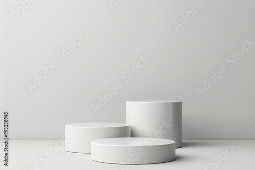 Minimalist white podium arrangement in a soft-lit studio, clean lines, smooth textures, perfect for high-end product mockups