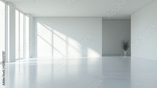 Minimalist White Room Interior Design with Sunlight Streaming Through Large Windows