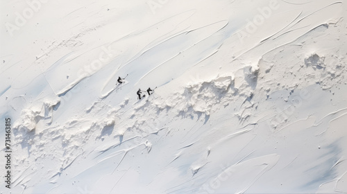 minimalist white snow on side of mountain, textured plaster abstract painting with tiny ski people scattered about