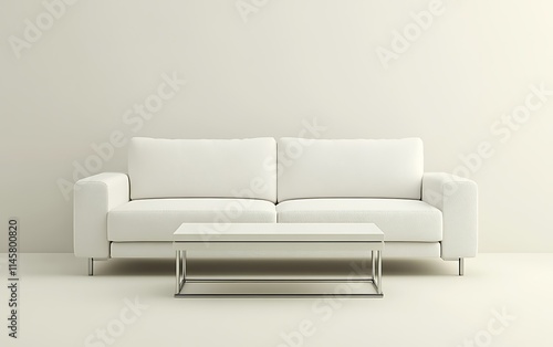 Minimalist white sofa and coffee table in a bright room.