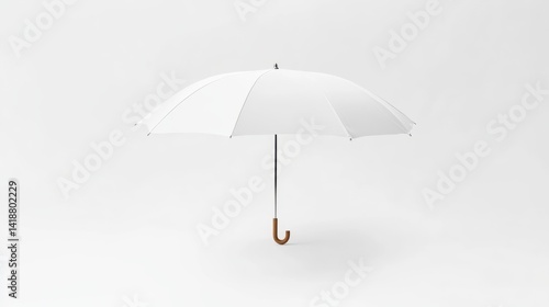 Minimalist white umbrella PNG-style photo, hovering over an invisible object on a white background, symbolizing protection