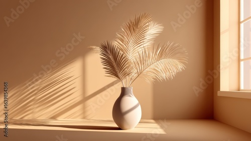 Minimalist white vase with dried palm leaves sits in warm sunlight by a window, casting soft shadows on a beige wall