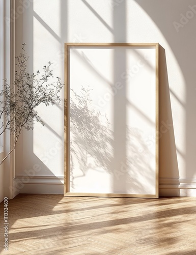Minimalist Wooden Picture Frame Mockup in Sunlit Room with Shadows and Herringbone Floor