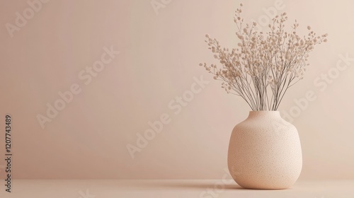 Minimalist workspace scene with blank laptop screen and elegant vase of dried flowers on neutral background