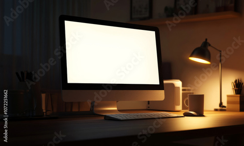 Minimalist Workspace with Desktop Computer and white screen for your mock up and Table Lamp in Cozy Night Light