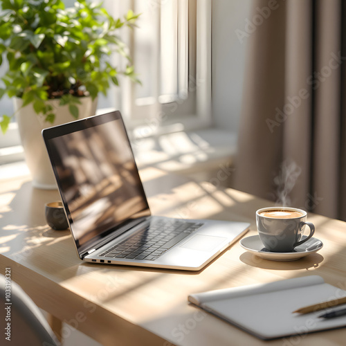 Minimalist Workspace with Laptop, Coffee, and Stationery – Clean Office Scene for Productivity