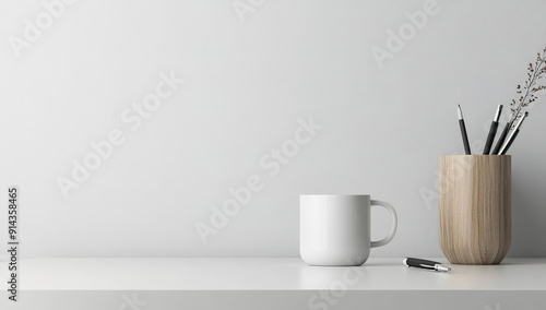 Minimalist Workspace with White Desk Setup and Simple Wooden Vase on Grey Wall Background