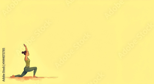Minimalist yellow banner for International Day of Yoga with a left-aligned watercolor figure in Tree or Lotus Pose, painted in soft black, green, or earthy tones. Right side is empty for text.
