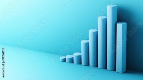 Minimalistic 3d bar graph render with cylinder shapes on a blue background for clean aesthetic