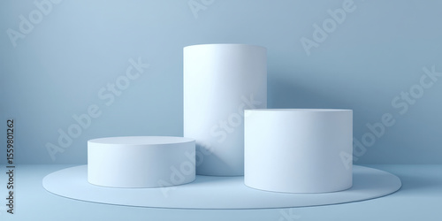 Minimalistic 3d white cylindrical podiums on smooth light blue-grey background
