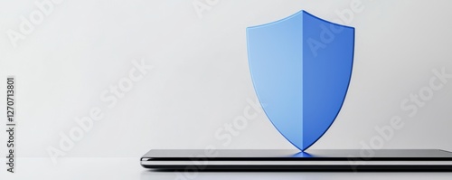 Minimalistic 3D-rendered blue shield standing on a digital tablet, modern cybersecurity, data privacy, and technology protection visualization