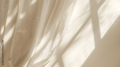 Minimalistic abstract gentle light beige background for product presentation with light and shadow of window curtains on wall : Generative AI