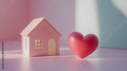 minimalistic arrangement featuring model house and heart, symbolizing love and home. soft colors create warm and inviting atmosphere, perfect for conveying affection