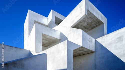 Minimalistic composition of concrete and glass in angular shapes contrasted against a clear sky