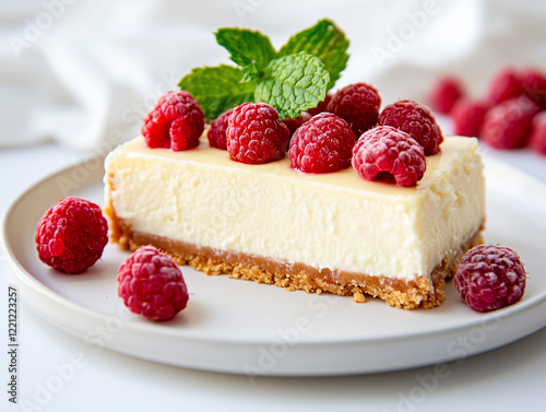 Minimalistic creamy cheesecake with raspberry and mint garnish on a white background.