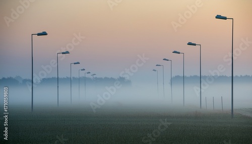 minimalistic foggy field with street lamps disappearing into thick mist on a surreal and moody morning
