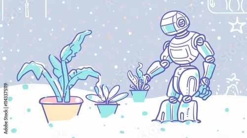 Minimalistic illustration of a robot nurturing potted plants in a space-like indoor garden, emphasizing automation, technology, and sustainability. AI generated.