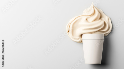 Minimalistic image of a white cylindrical container with a swirl of cream or mousse on a smooth, light gray background, highlighting texture and simplicity.