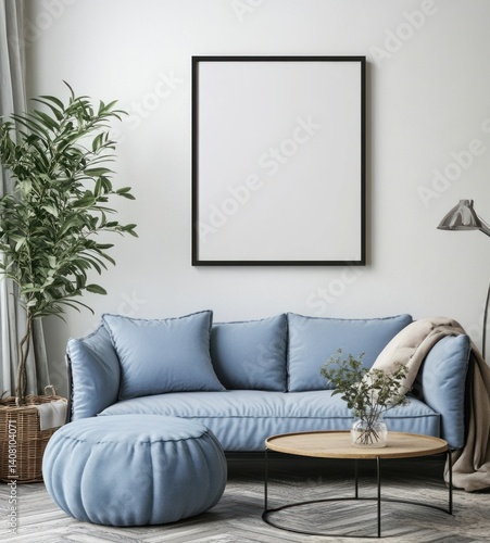 Minimalistic Living Room Mockup Poster Frame in Scandinavian Interior with Pastel Blue Furniture and Natural Light