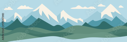 Minimalistic mountain landscape, snow-covered peaks and hills, vector image, panoramic view