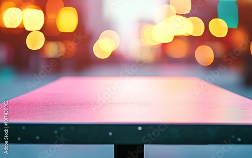Minimalistic Neon Pastel Pink Table Against Urban Bokeh Background for Product Display
