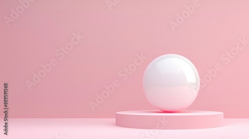 Minimalistic pink background with a white sphere on a cylindrical pedestal. Abstract design with simple, clean, and modern aesthetics.