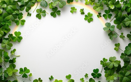 Minimalistic soft white background with a delicate rainbow and shamrocks in the corners for Saint Patricks Day, with space for text