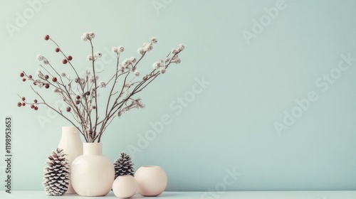 Minimalistic still life arrangement with vases, branches, and pinecones on a light blue background featuring ample copy space
