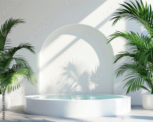 Minimalistic white bathtub in a bright room with sunlight and tall green palm plants, creating a serene and elegant atmosphere.