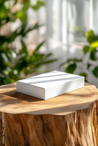 minimalistic white box wooden surface, surrounded by greenery, evokes sense of calm and