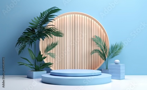 Minimalistic Wooden Podium with Abstract Blue Background for Product Display and Cosmetic Design. Generative AI illustrations.