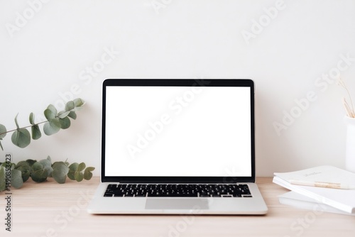 minimalistic workspace setup for career coaching with open laptop and documents on tidy desk neutral tones