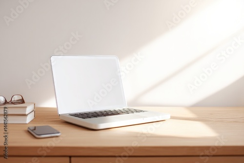 minimalistic workspace with open laptop on wooden desk books stacked beside it soft natural lighting fills scene