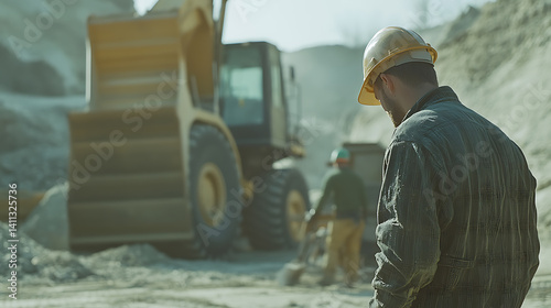 Mining foreman monitoring workers unloading heavy equipment at a site. Featuring logistics and leadership