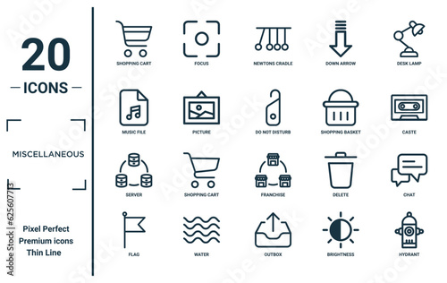 miscellaneous linear icon set. includes thin line shopping cart, music file, server, flag, hydrant, do not disturb, chat icons for report, presentation, diagram, web design
