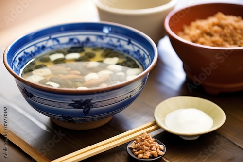 miso soup in ceramic bowl, wooden spoon, soybeans in background