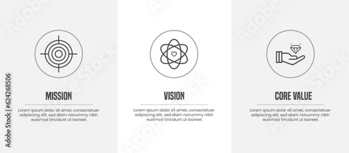 Mission, Vision and core values template with eye catchy icons, business starting decision steps, vector illustration eps 10