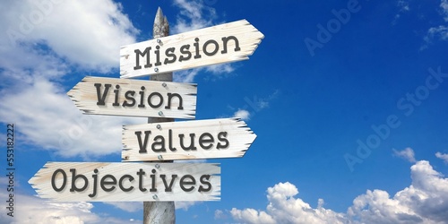 Mission, vision, values, objectives - wooden signpost with four arrows