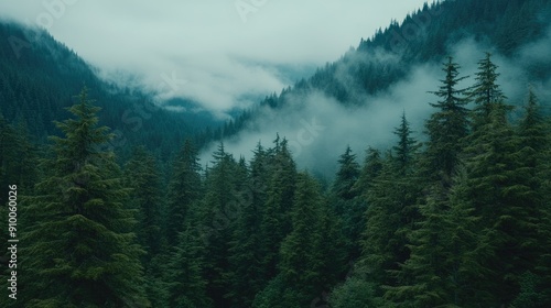 Mist envelops a dense evergreen forest, showcasing a vibrant array of green trees under soft morning light.