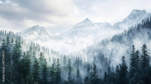 Mist rises over a dense forest with towering, snow-capped mountains in the background, creating a serene, mystical landscape.