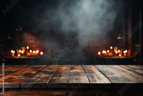 Misty ambiance envelops vacant wooden table, a stage for your products to shine Generative AI