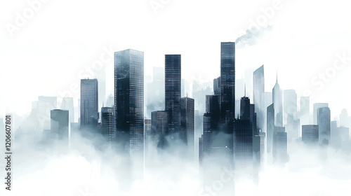 Misty Cityscape Skyscrapers Emerging from Foggy Urban Horizon