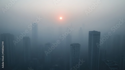 Misty Cityscape with Sun Peeking Through Clouds.