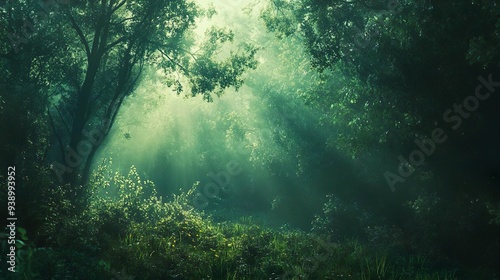 Misty dawn in a dense forest with gentle light ideal for serene and peaceful backgrounds