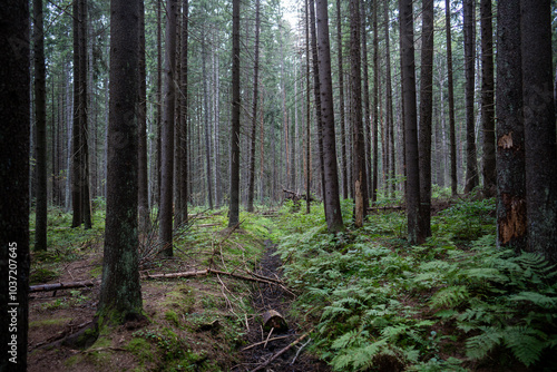 Misty day in dark coniferous forest, thicket among trees with clear sky. Ferns and grass form undergrowth, wild nature with fallen branches after wind. Wildlife, park strolling, tourism, travel