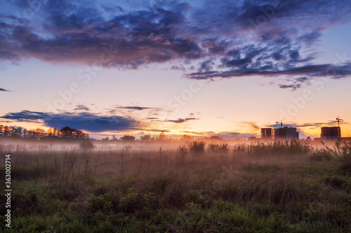 Misty field against the backdrop of a beautiful cloudy sky at sunset. Beautiful cityscape on a foggy evening.
