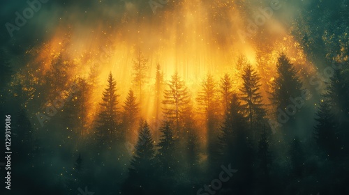 misty forest at dawn, with sunlight filtering through the trees