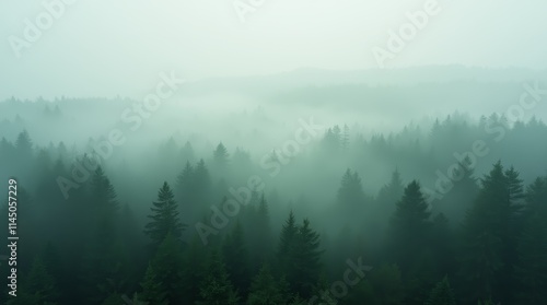 Misty Forest Canopy: Ethereal Landscape with Fog and Evergreen Trees