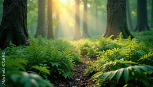 misty forest floor, ferns swaying softly in the morning light, dawn, foliage