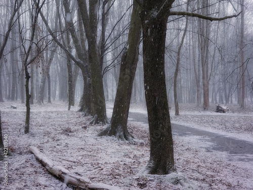 Misty forest in late autumn. Beginning of winter in the forest. First snow in the park. Atmospheric gloomy trees.